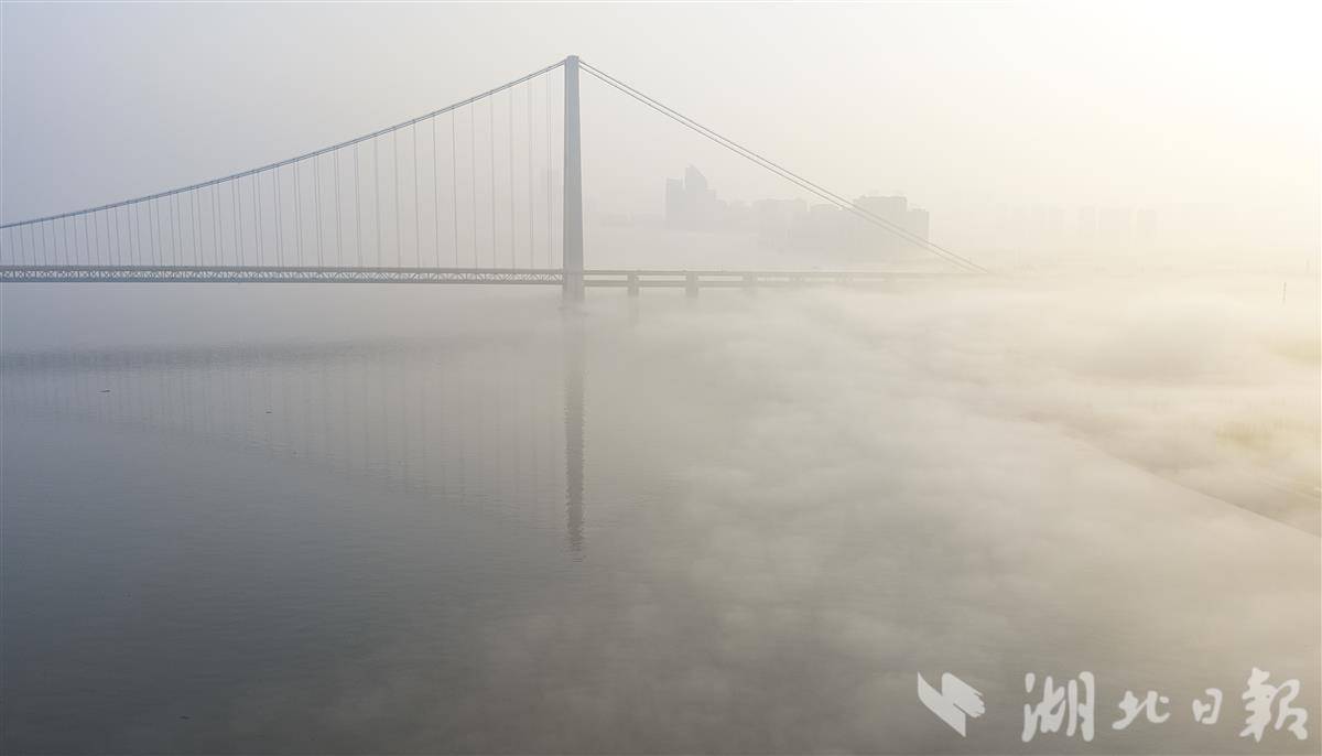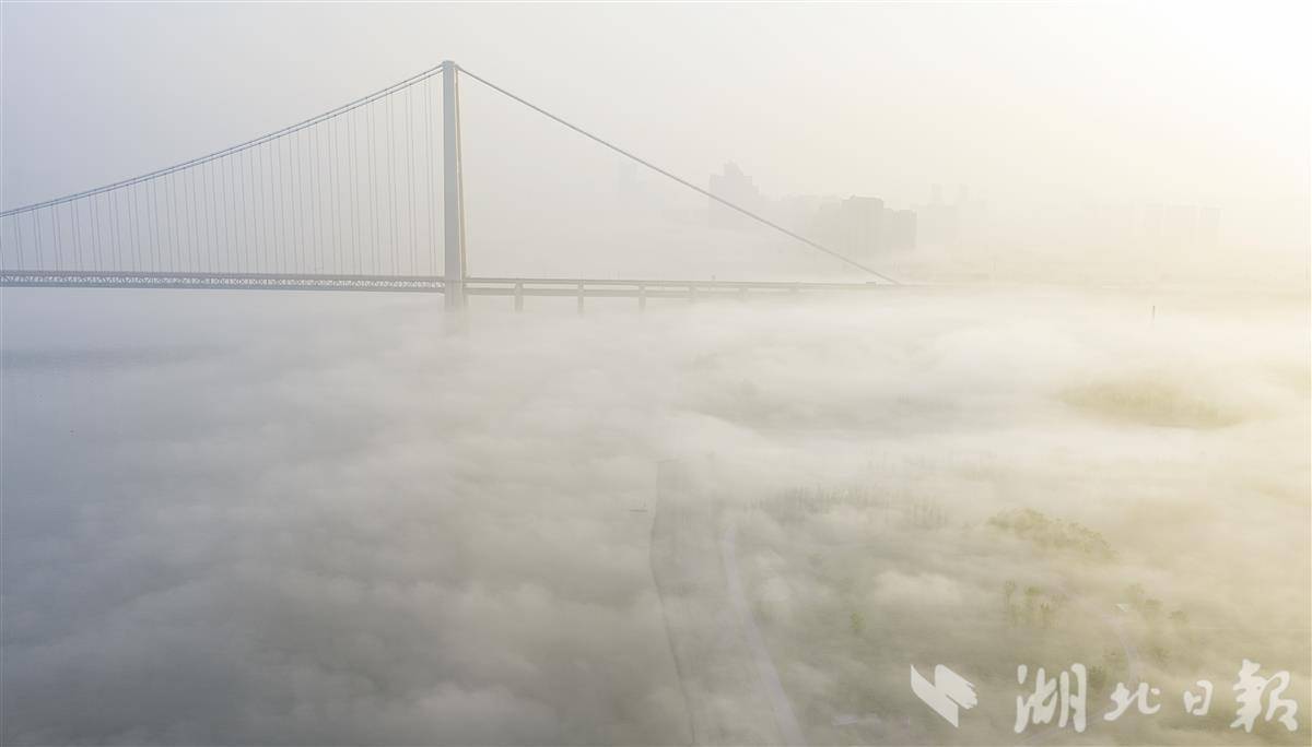 4月17日,武汉市遭遇大雾天气。洪山江滩和杨泗港长江大桥在雾气腾腾中若隐若现。