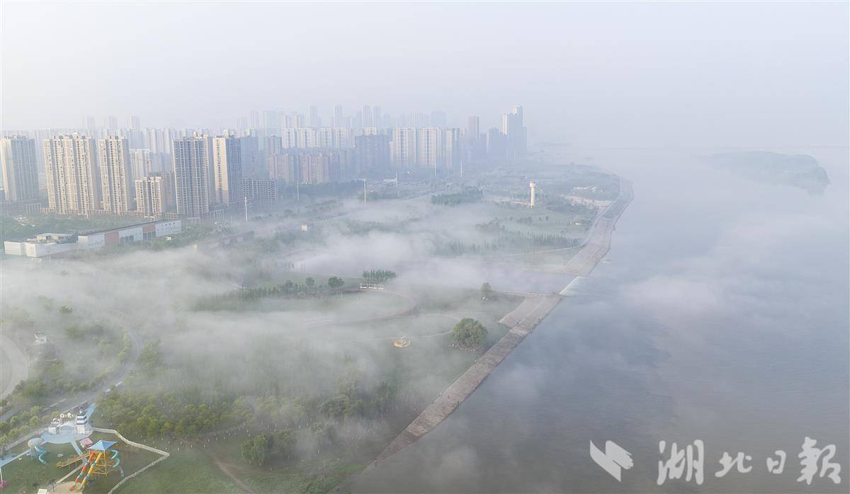 4月17日,武汉市遭遇大雾天气。洪山江滩在雾气腾腾中若隐若现。